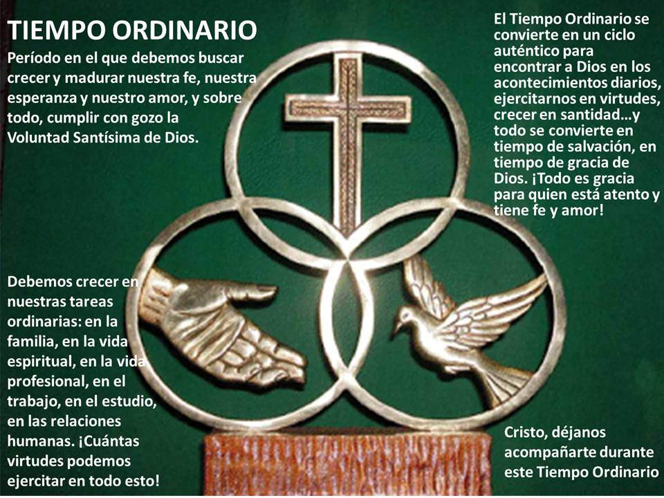El Tiempo Ordinario es la temporada en la que celebramos la vida y las enseñanzas de Jesucristo y lo que significa ser su discípulo. El nombre de este tiempo deriva de la palabra ordinal, que significa «contar». Es llamado Tiempo Ordinario porque las semanas se nombran en orden numérico. Ordinario no significa de poca importancia, anodino, insulso, incoloro. Sencillamente, con este nombre se le quiere distinguir de los “tiempos fuertes”, que son el ciclo de Pascua y el de Navidad con su preparación y su prolongación.