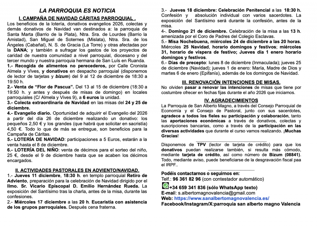 Os compartimos las actividades a realizar en nuestra comunidad cristiana así como acciones solidarias que desde la parroquia preparamos para esta Navidad y os damos de antemano las gracias por vuestra participación. La ayuda siempre llega, en especial en estos días para colaborar con los más necesitados de parroquias de nuestra diócesis, especialmente los damnificados por las inundaciones que ha habido en nuestra provincia y con los países en vías de desarrollo en especial con nuestra parroquia hermana de San Luís Rambo en la diócesis de Nyundo en Ruanda y nuestro hermano Theoneste.